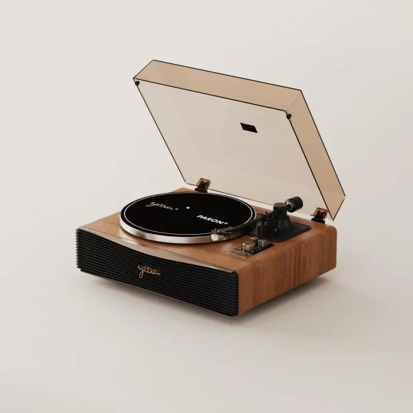 The Paron features a classic Walnut wood finish that brings a retro aesthetic to any space while housing sophisticated modern audio components. It is built with a belt-drive system and an Audio-Technica AT3600L moving magnet cartridge for high-precision tracking and pure sound reproduction. The integrated 4-speaker system—comprising two mid-bass drivers and two dome tweeters—delivers a rich, full-range HIFI sound without requiring external equipment. Its suspension shock-absorption structure minimizes unwanted vibrations, ensuring stable and clear audio performance.