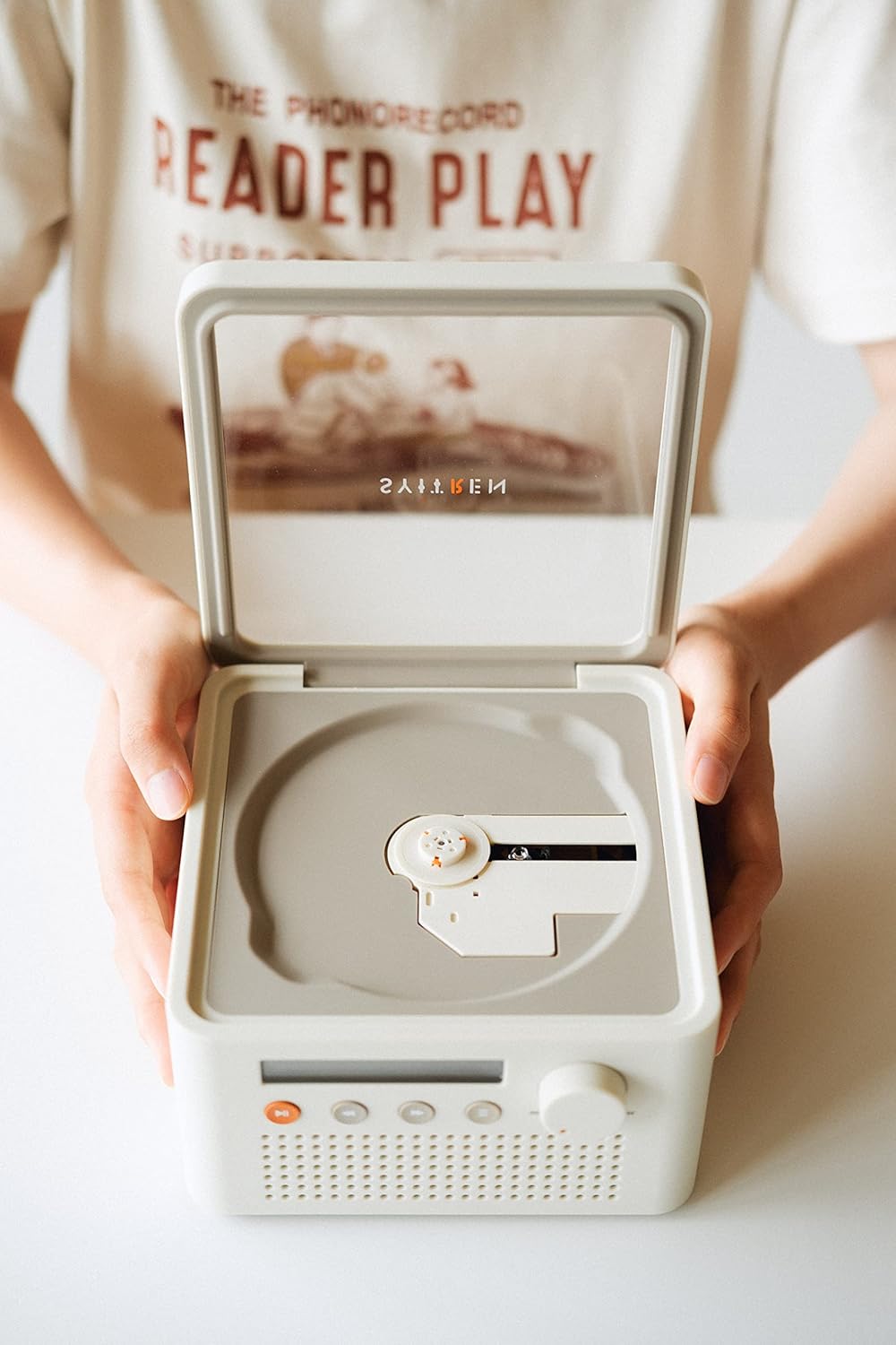 The Syitren R200 is a versatile, all-in-one portable CD player that features built-in speakers and a distinctive retro "lunch box" design, making it a functional and aesthetic piece for any desktop.