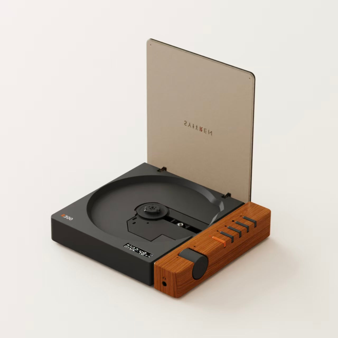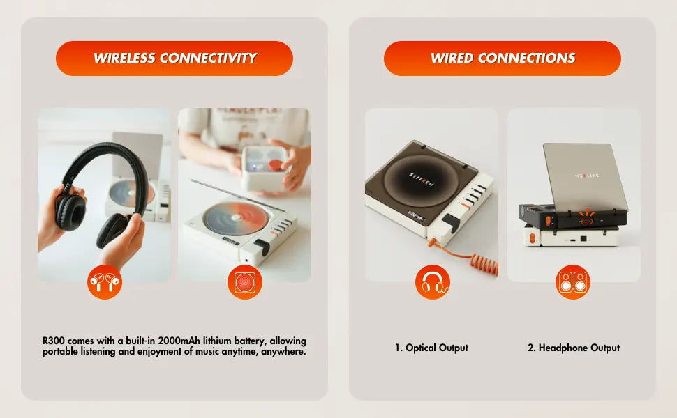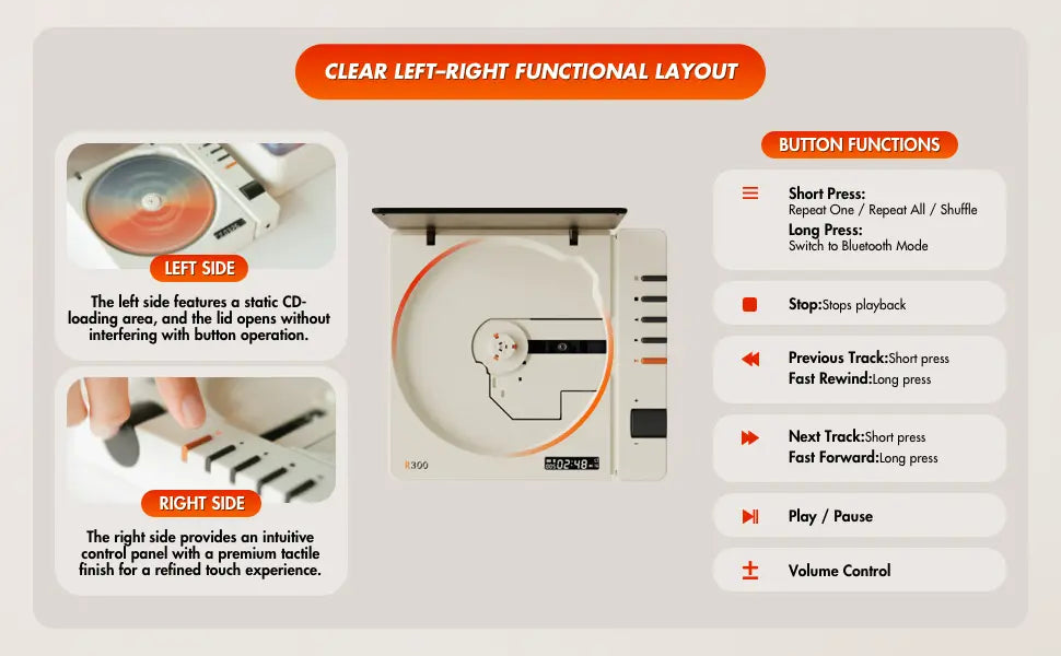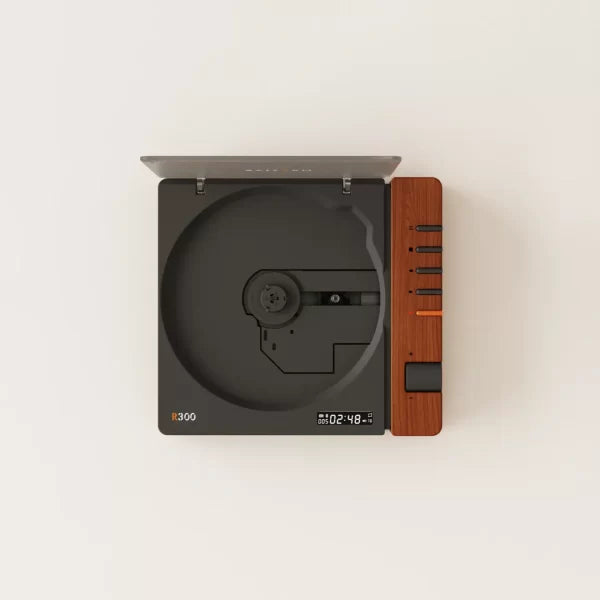 The R300 features a minimalist, small retro design available in various finishes like Black Wood and Retro White. It is designed as a pure CD player with no built-in speakers, ensuring that audio quality is not compromised by internal vibrations; instead, users can connect their own preferred high-quality speakers or headphones. The device includes a 2000mAh battery for portable use and features a distinctive orange play/pause button on its side-mounted control panel. Its advanced AB5305UT decoding chip provides high-fidelity playback, and it even supports SPDIF optical output for high-quality digital connections to home audio systems.