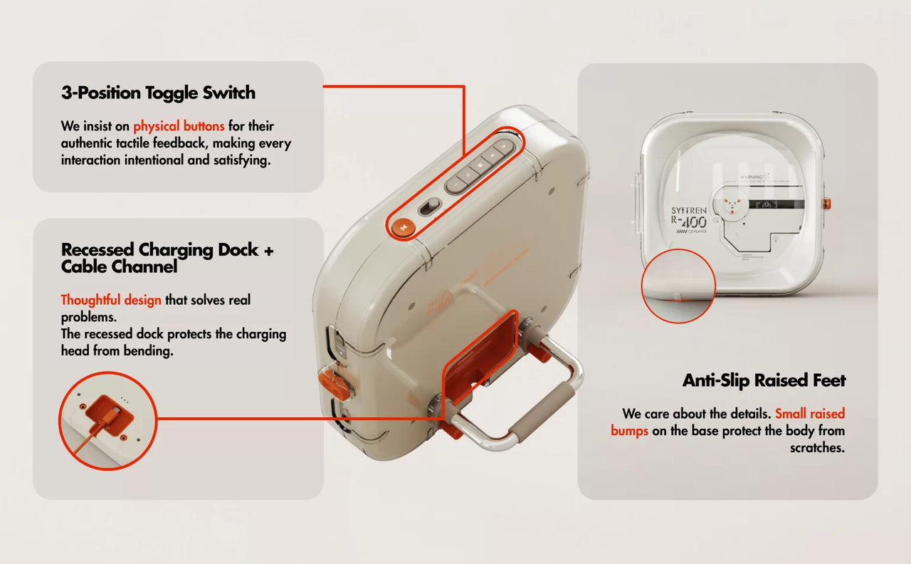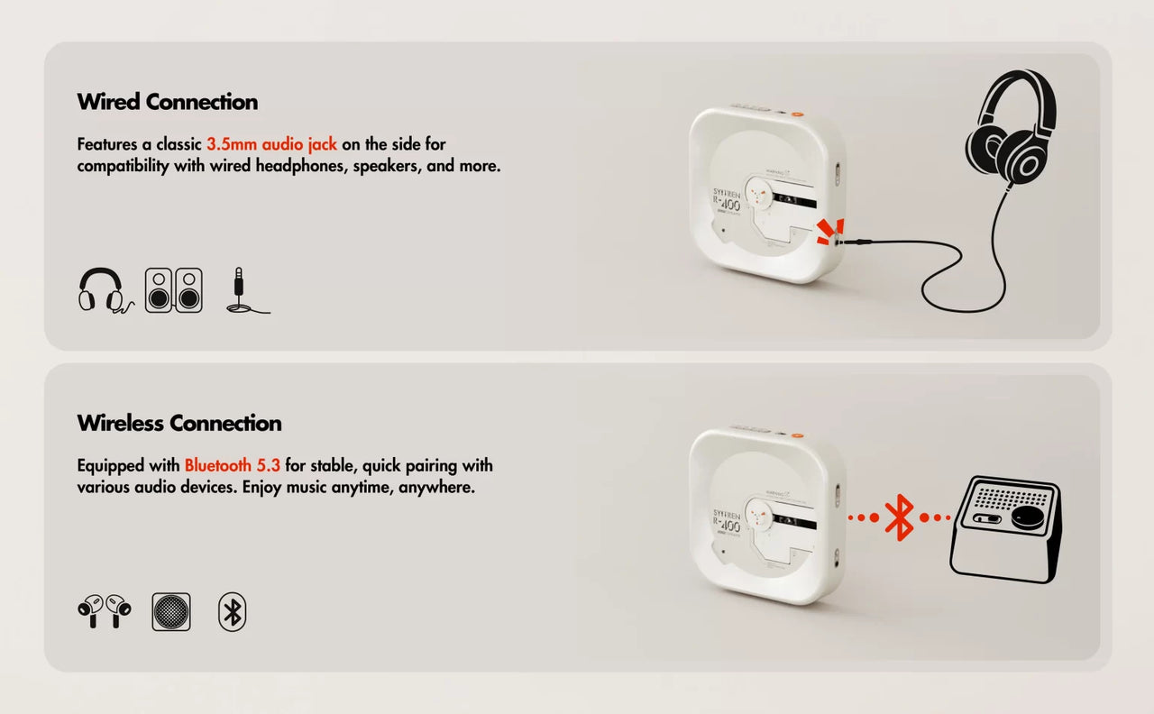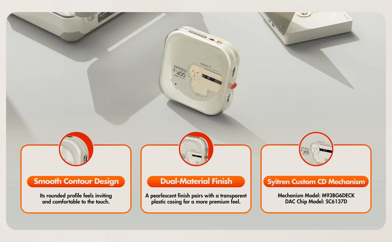 The Syitren R400 is a portable, retro-inspired CD player designed for music enthusiasts who appreciate a blend of classic aesthetics and modern wireless functionality.